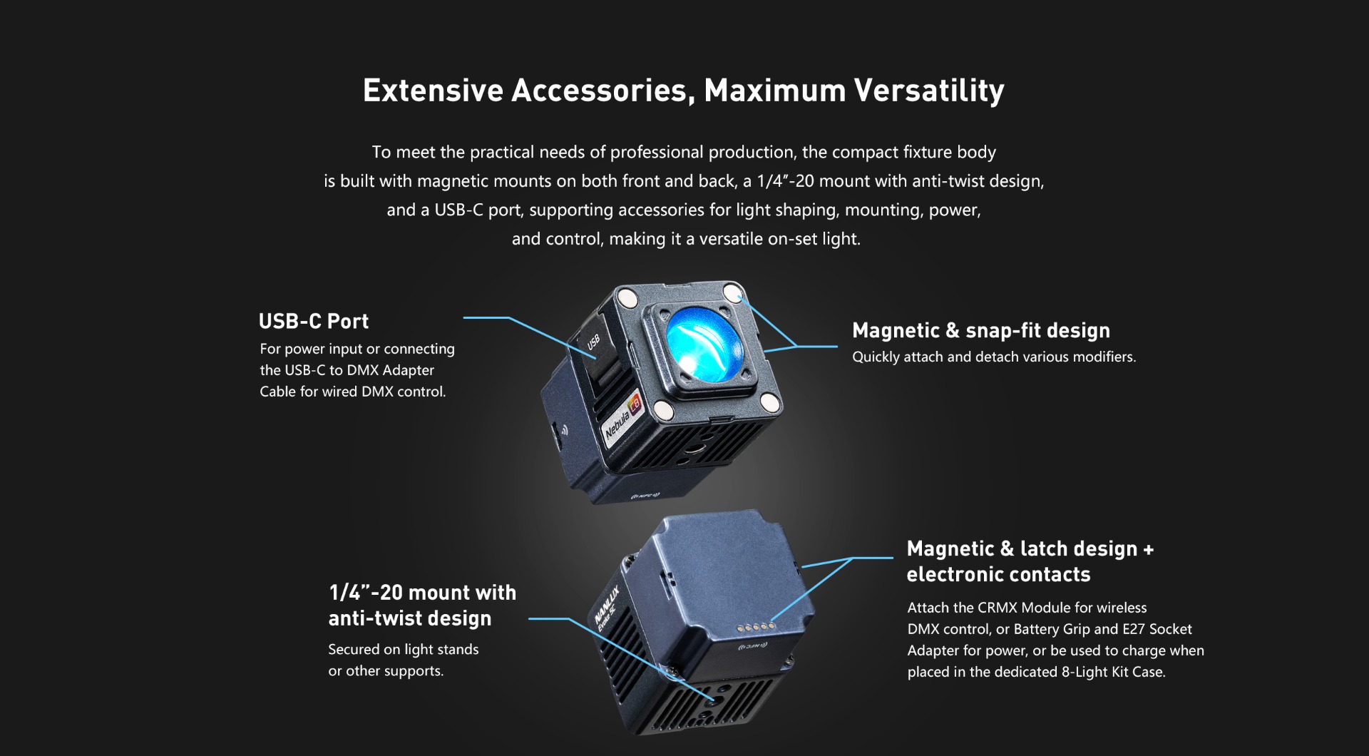 - 5 control methods – On-board, NANLINK App, CRMX, DMX/RDM, NFC