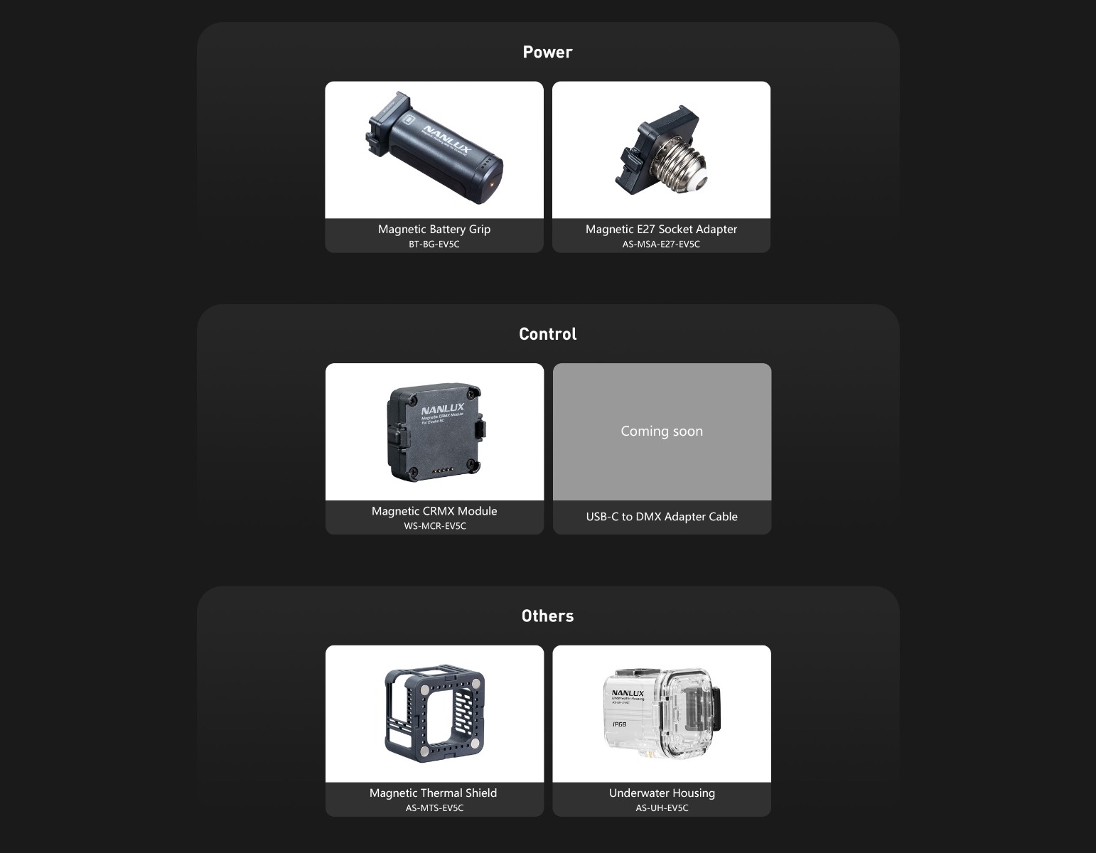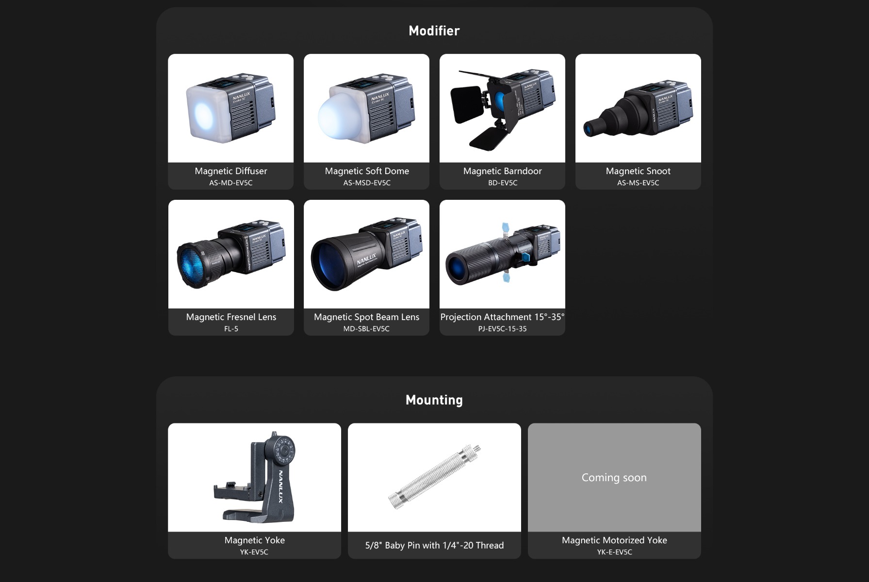 | Strapline | The NANLUX Evoke 5C is the tiny professional spotlight with advanced light shaping capabilities and Nebula C8 colour light engine. The Evoke 5C combines portability, advanced colour control, durability, and flexible power/control options, making it suitable for a wide range of professional lighting scenarios. First UK shipment arriving end of April - beginning of May 2026 |