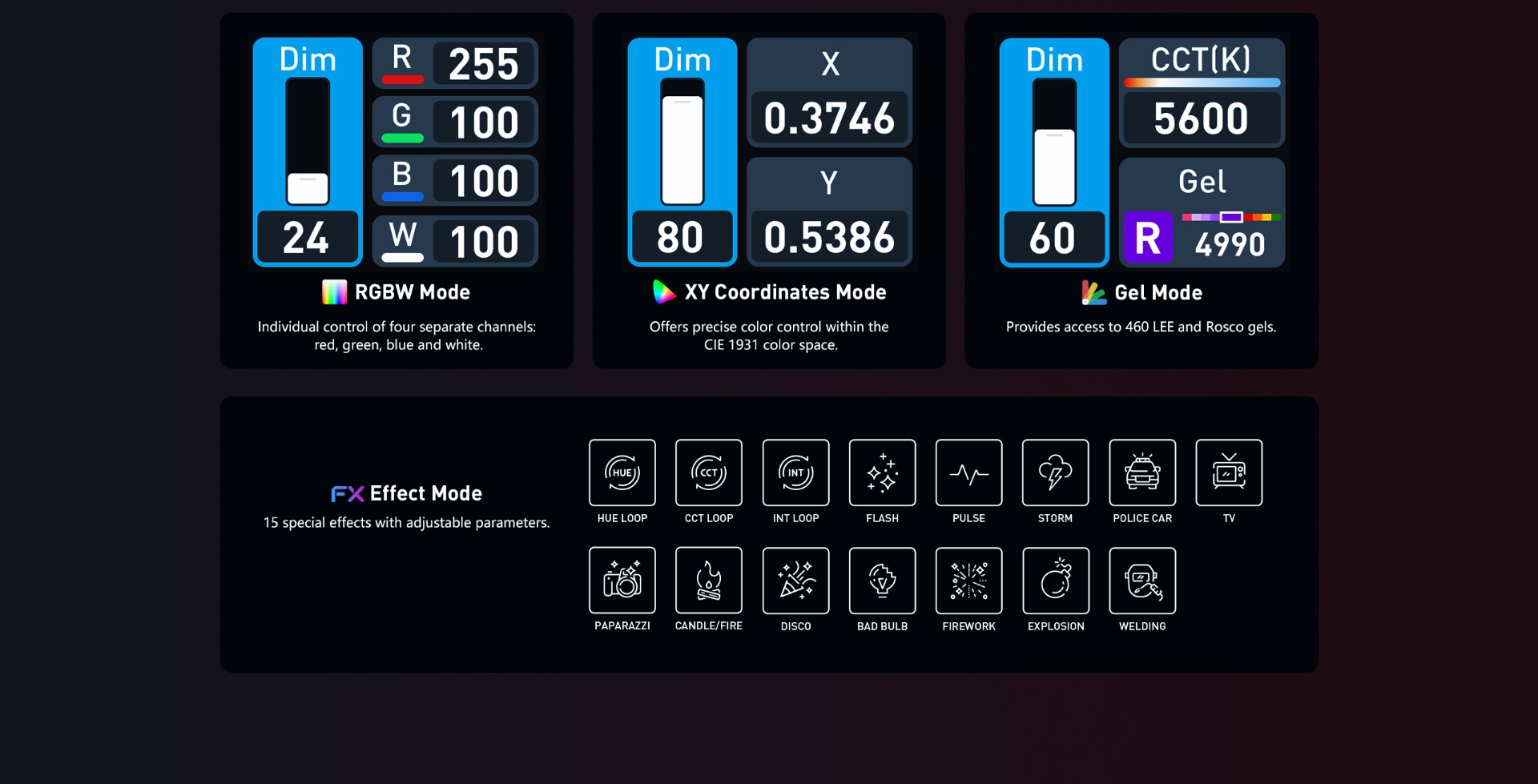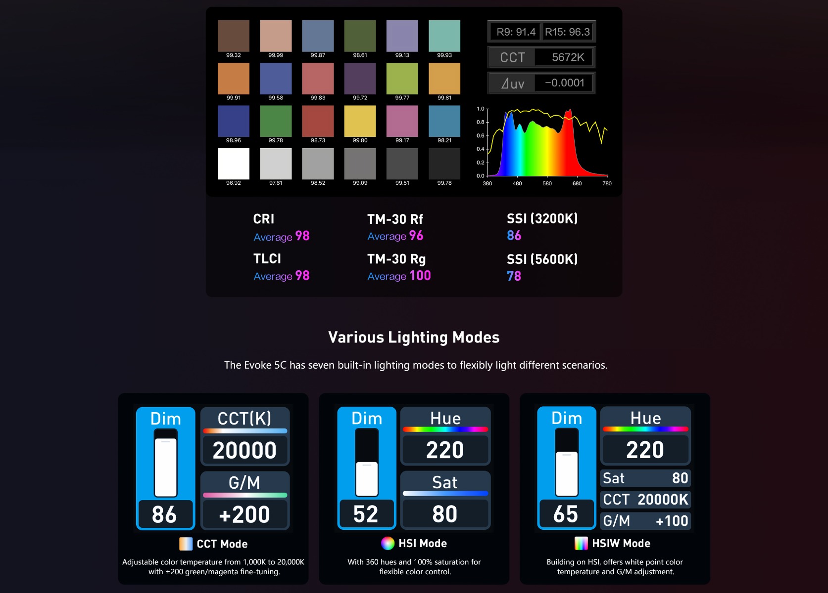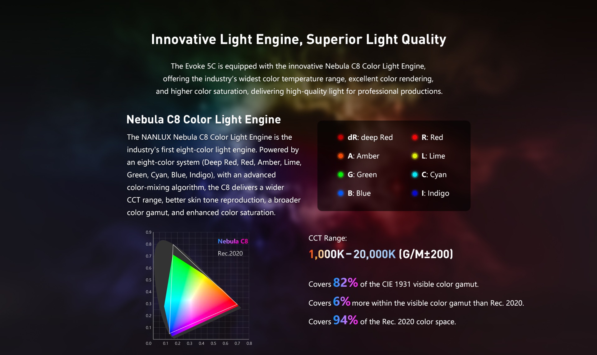 - Innovative Nebula C8 Light Engine (combining deep red, red, amber, lime, green, cyan, blue, indigo) to achieve 1,000K-20,000K with G/M±200 adjustment